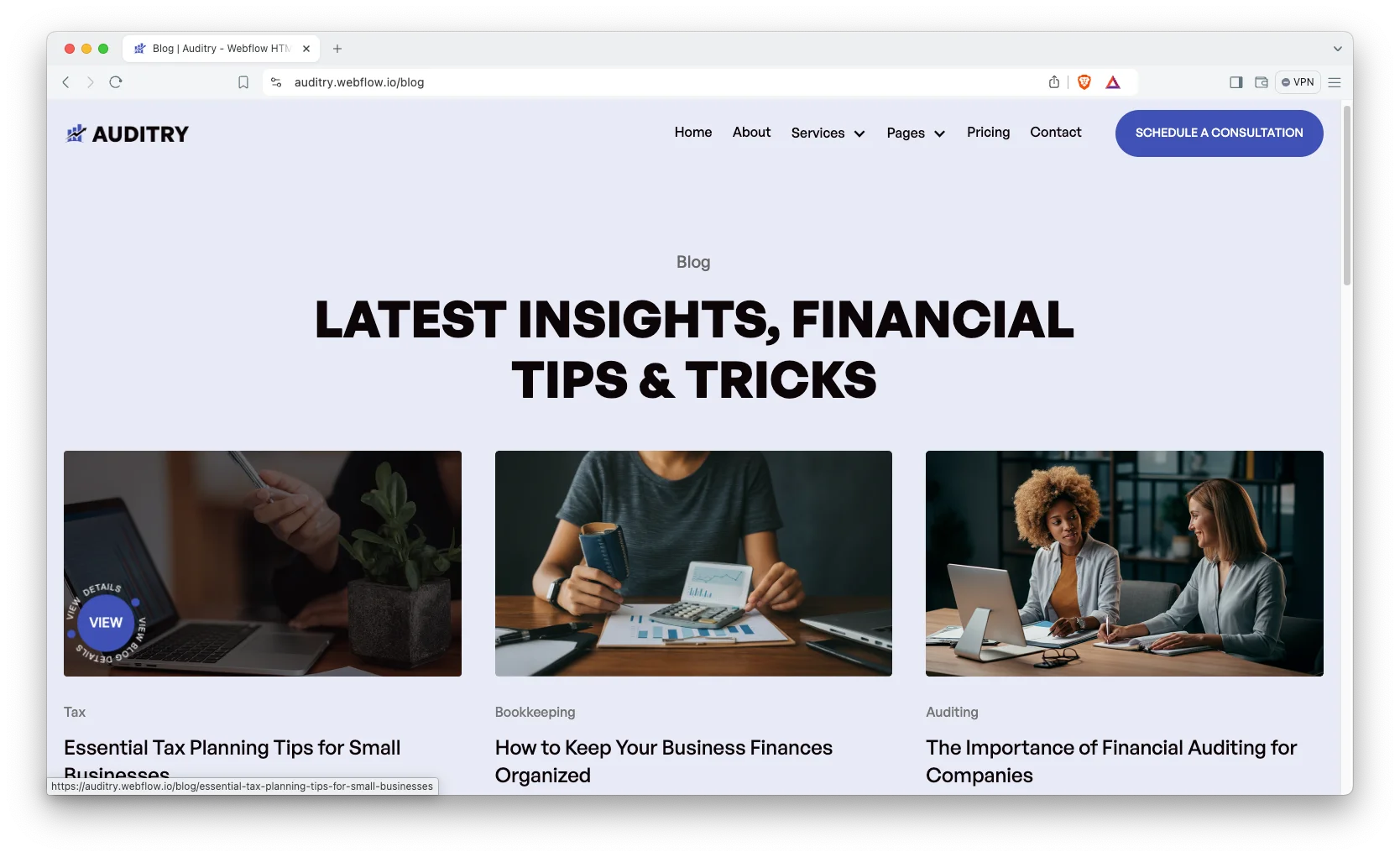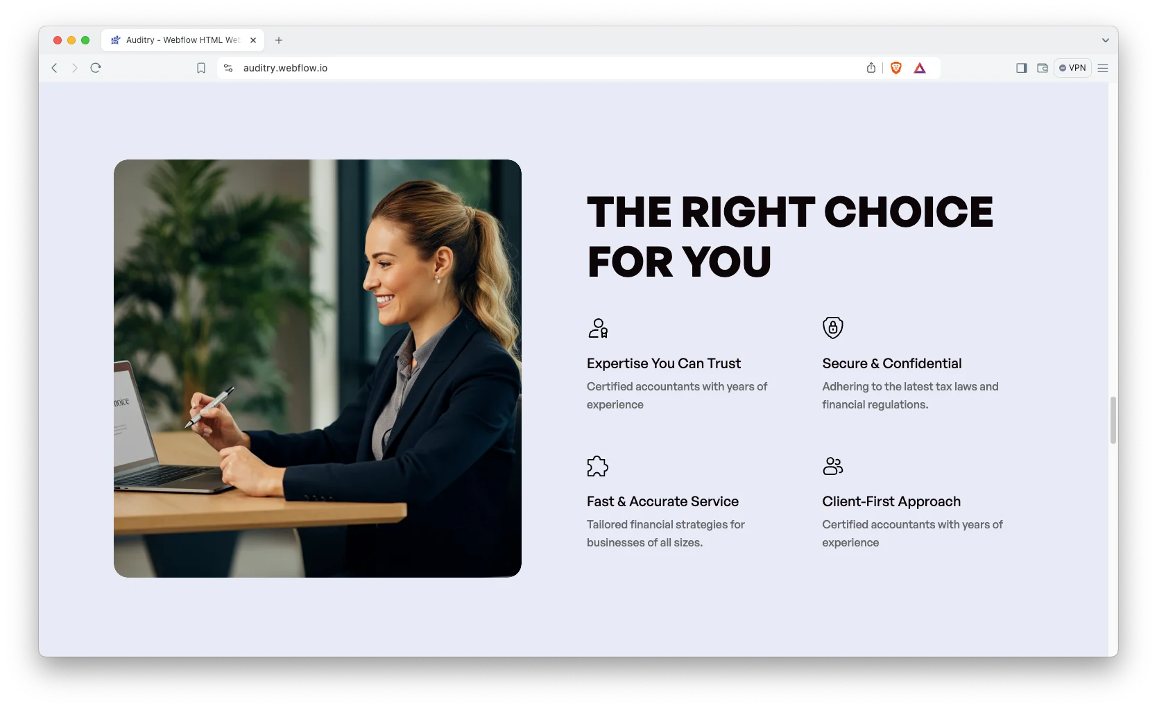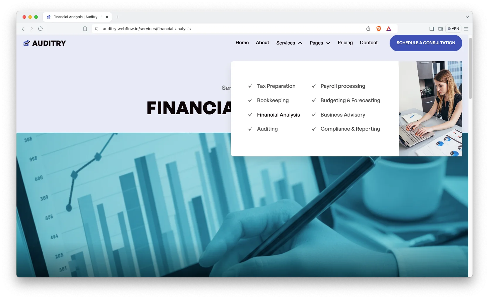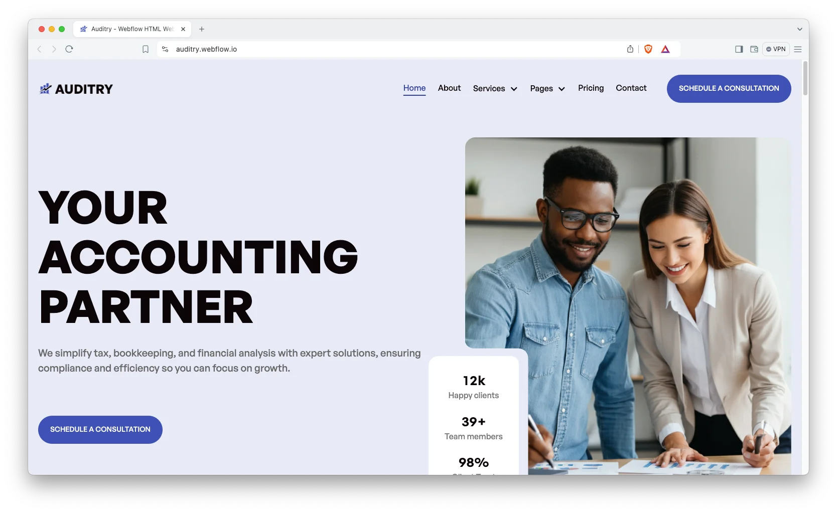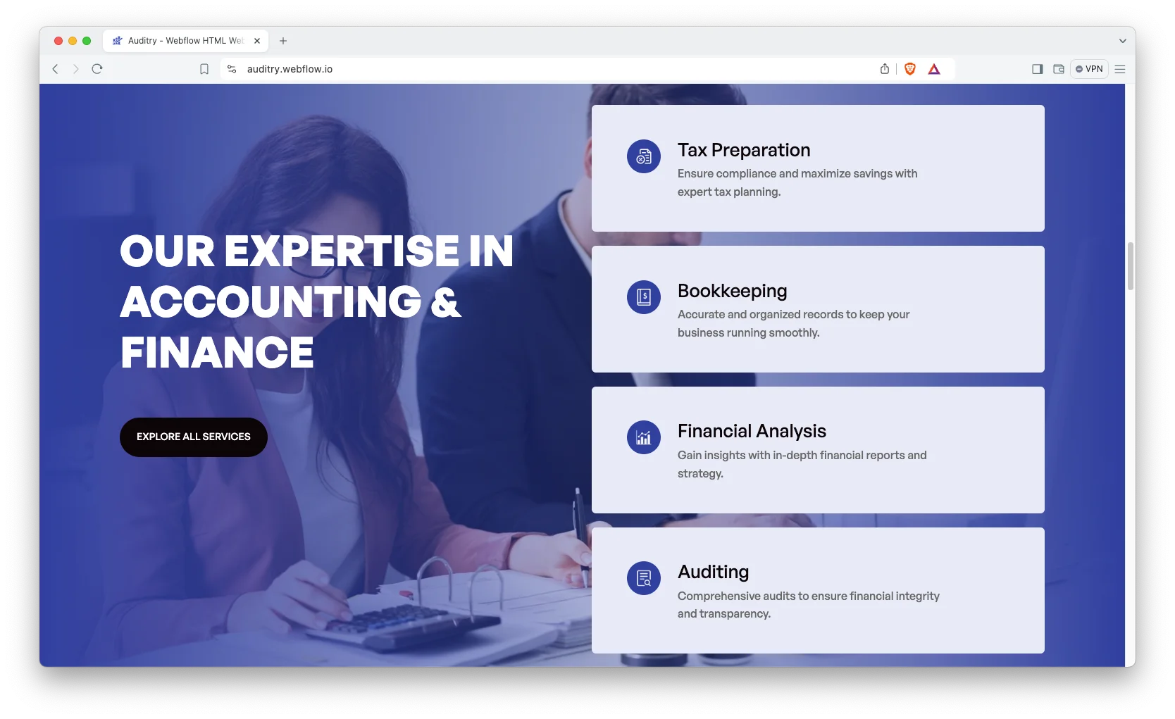 Auditry combines minimal design, charming animation, advanced interaction, and CMS functionality. Perfectly suited for finance, accounting, financial advisors, banking, consulting professionals or other financial advisory websites.