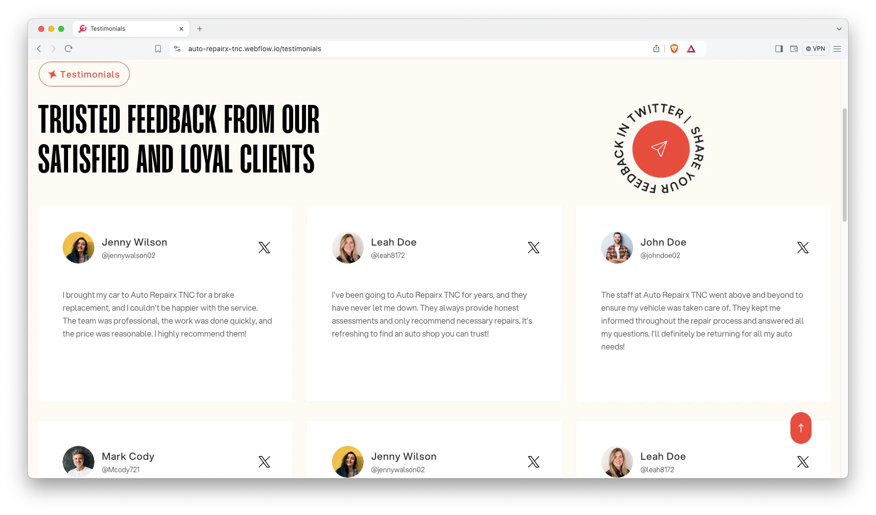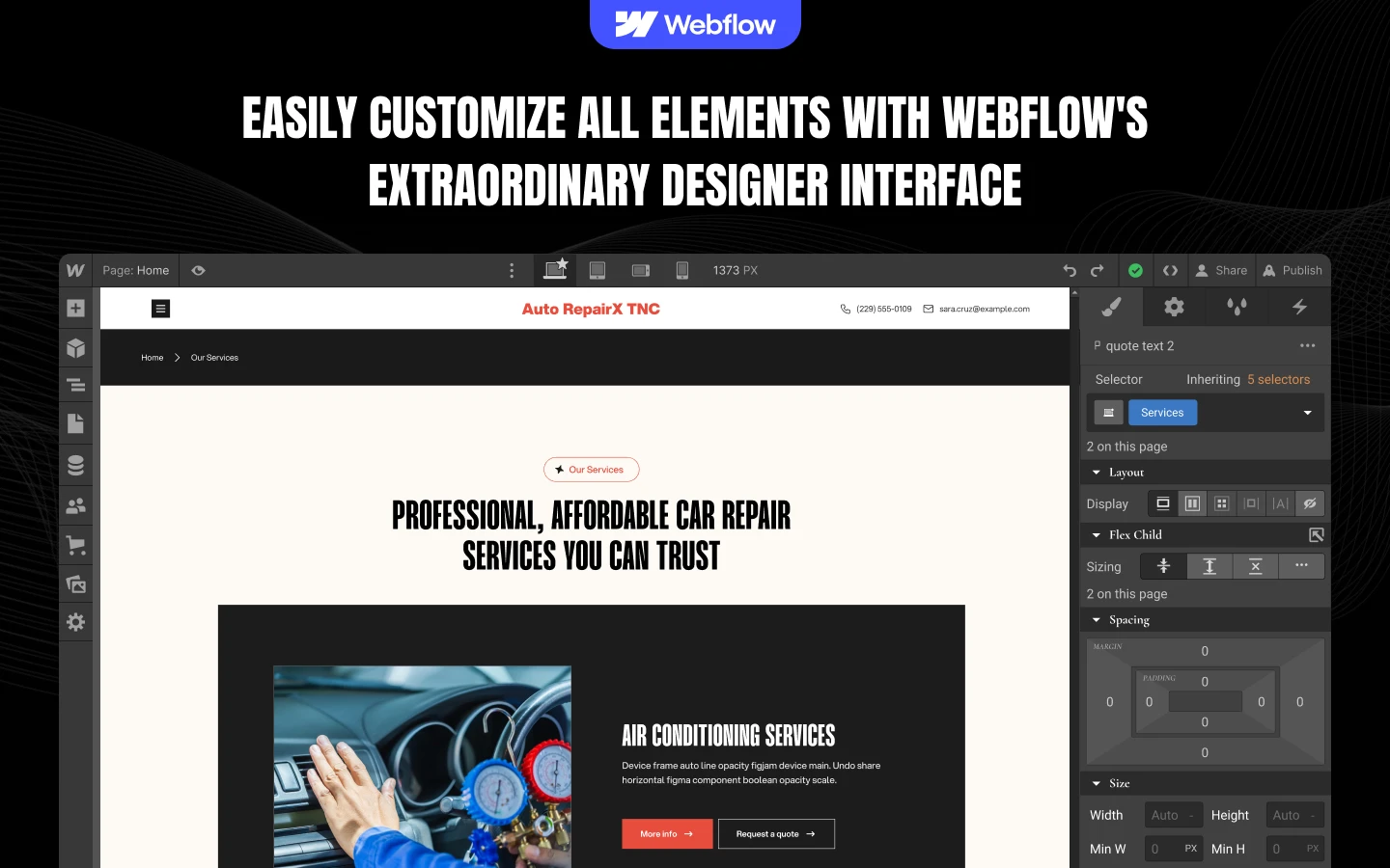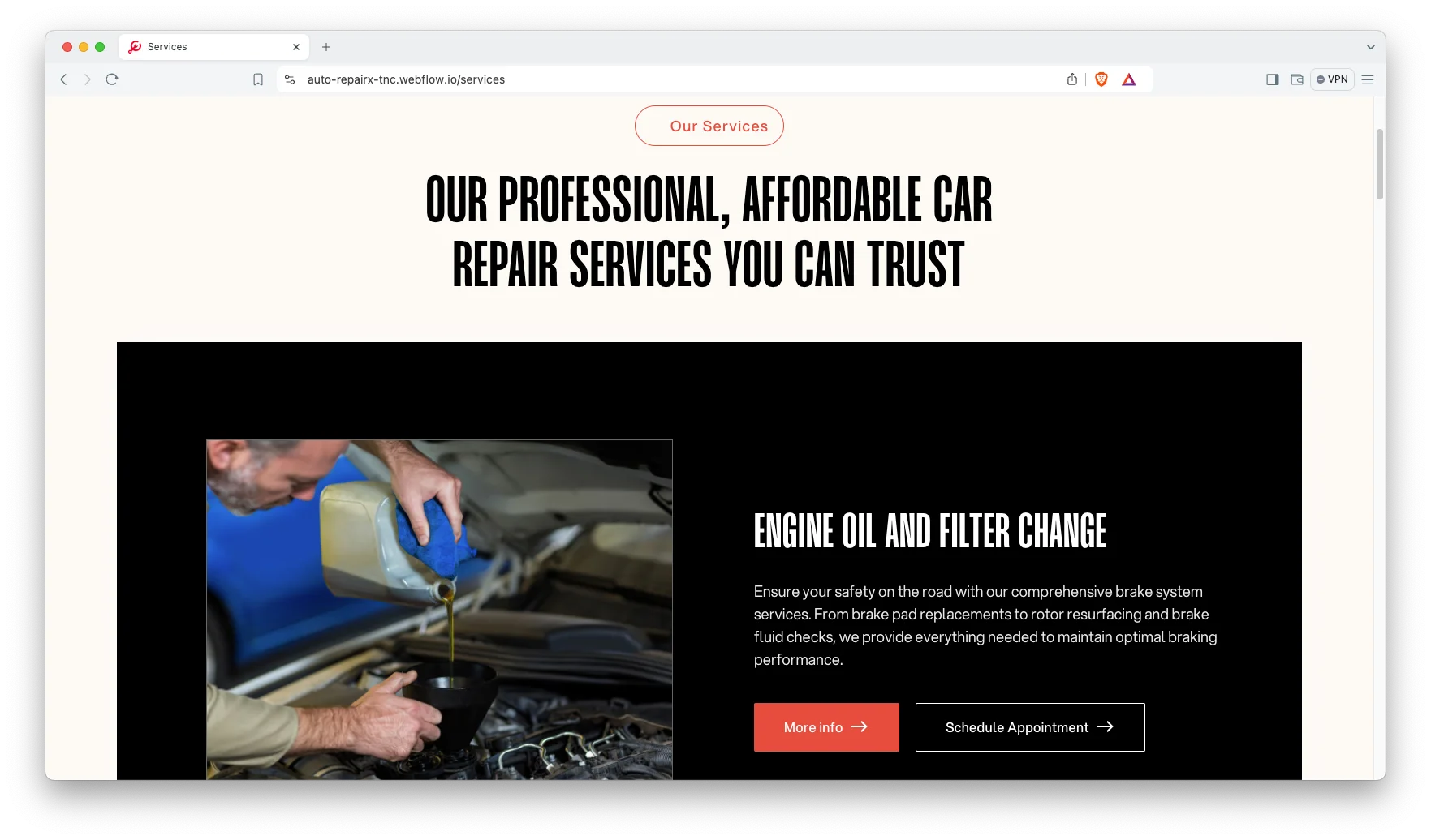 Auto RepairX TNC is a high impact webflow automotive template specially designed for all types of car repair service & workshops. Showcase your expertise and services, sell products with integrated eCommerce, and grow your automotive business.
