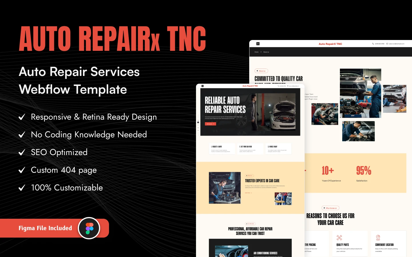 Auto RepairX TNC is a high impact figma automotive template specially designed for all types of car repair service & workshops. Showcase your expertise and services, sell products with integrated eCommerce, and grow your automotive business.