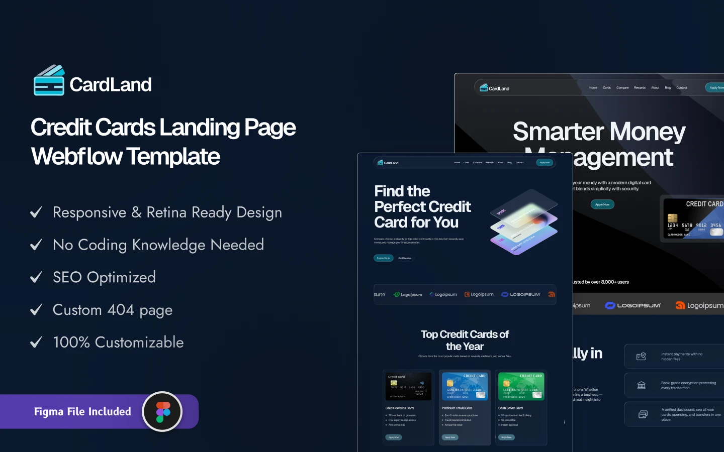 Get the Figma file of Cardland Webflow website template. Simplify your credit card marketing and promotions with Cardland Webflow dark website template with 3 dedicated landing page options. Designed for credit card issuers, fintech firms, banks, and financial marketers.