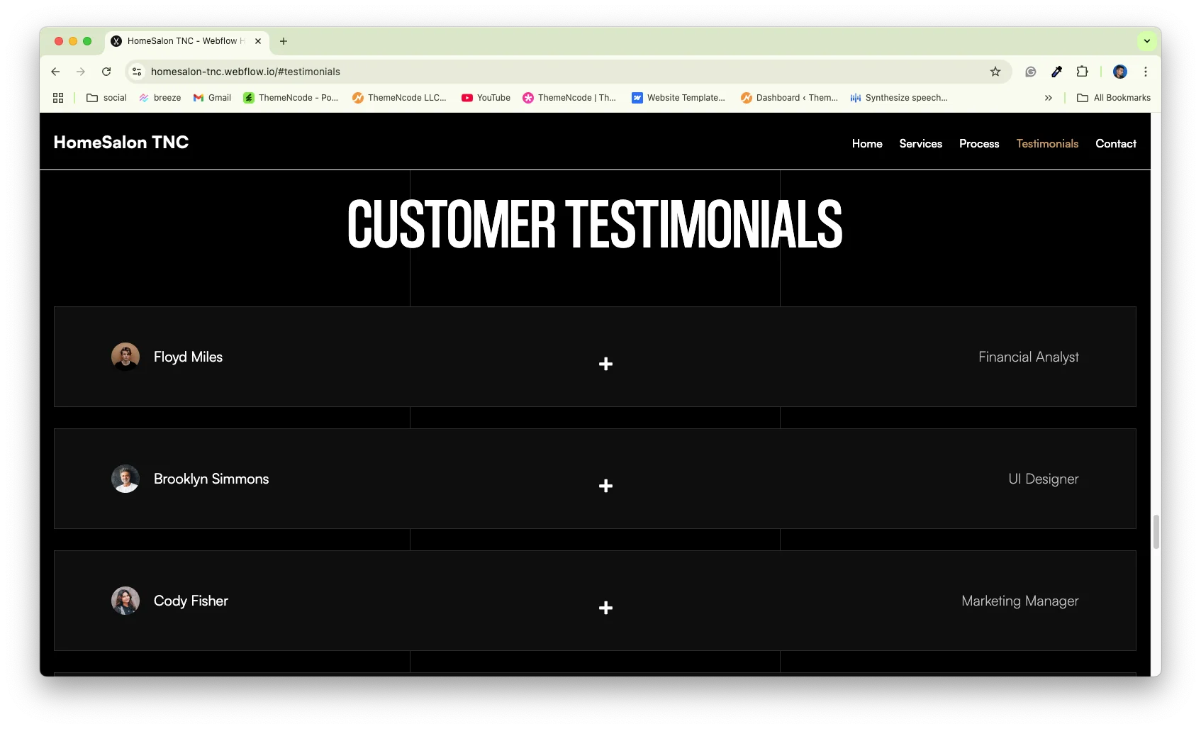 HomeSalon TNC is a single page figma webflow template designed with such details to give you the most professional salon home service. Highlight your skills and beauty services, book appointments and attract more clients to your business.