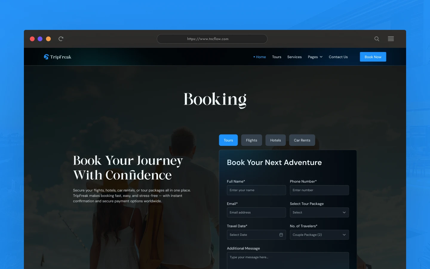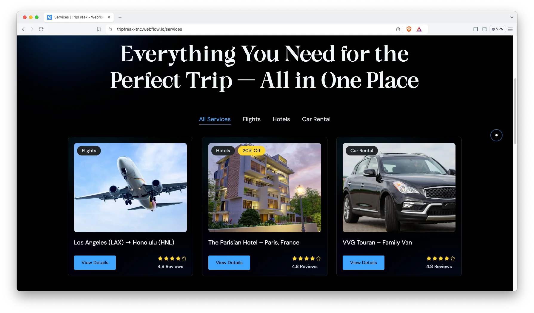Simplify Trip Booking with TripFreak. A perfect Webflow template that highlights your online travel agency, flight booking, hotel booking, car rental and tours services. Suitable for travel, tourism, and online booking platforms.