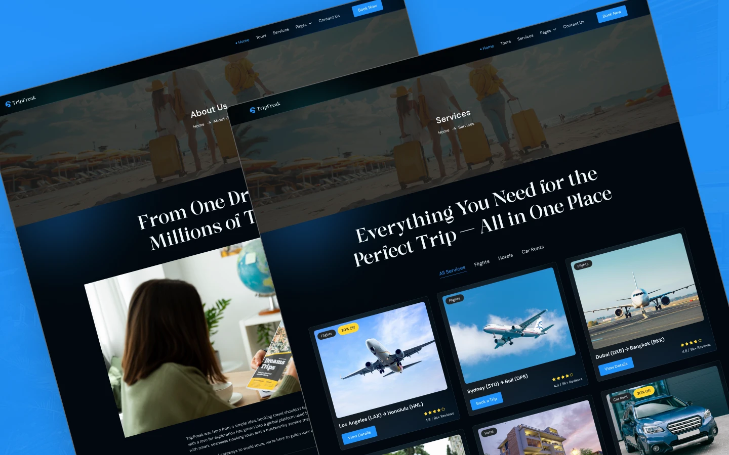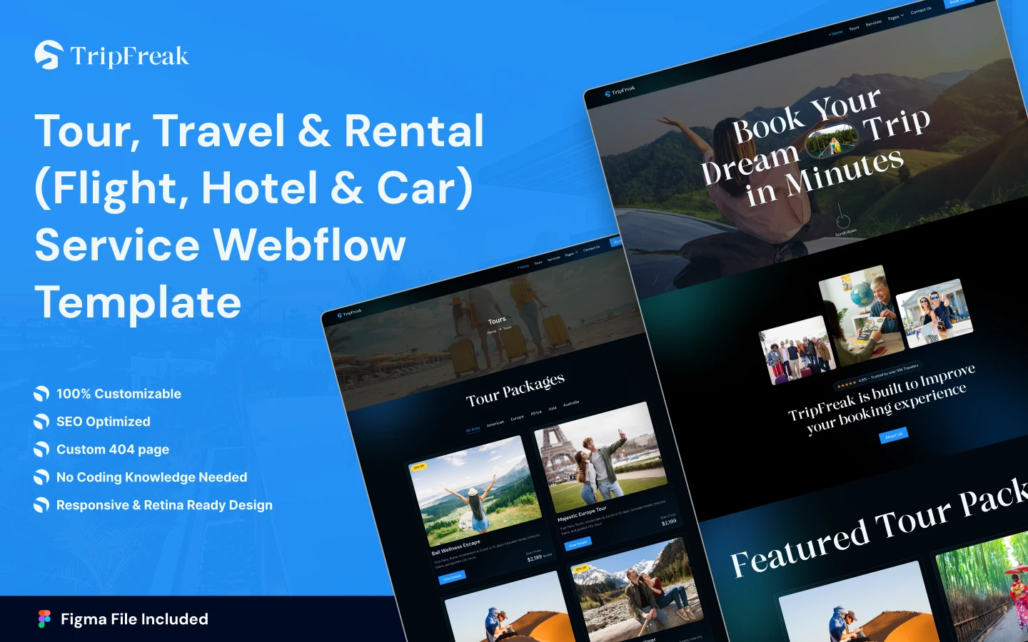 Get the Figma file of TripFreak Webflow website template. Simplify Trip Booking with TripFreak. A perfect Webflow template that highlights your online travel agency, flight booking, hotel booking, car rental and tours services. Suitable for travel, tourism, and online booking platforms.